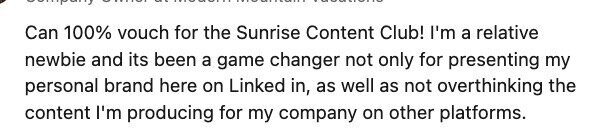 "Sunrise Content Club...if you want to increase your consistency in everything, flex this muscle and watch what happens. You may come for content strategies, but you'll stay for the community. If you think you don't have anything to say or share, these prompts will creep you creating way beyond one post each day!"